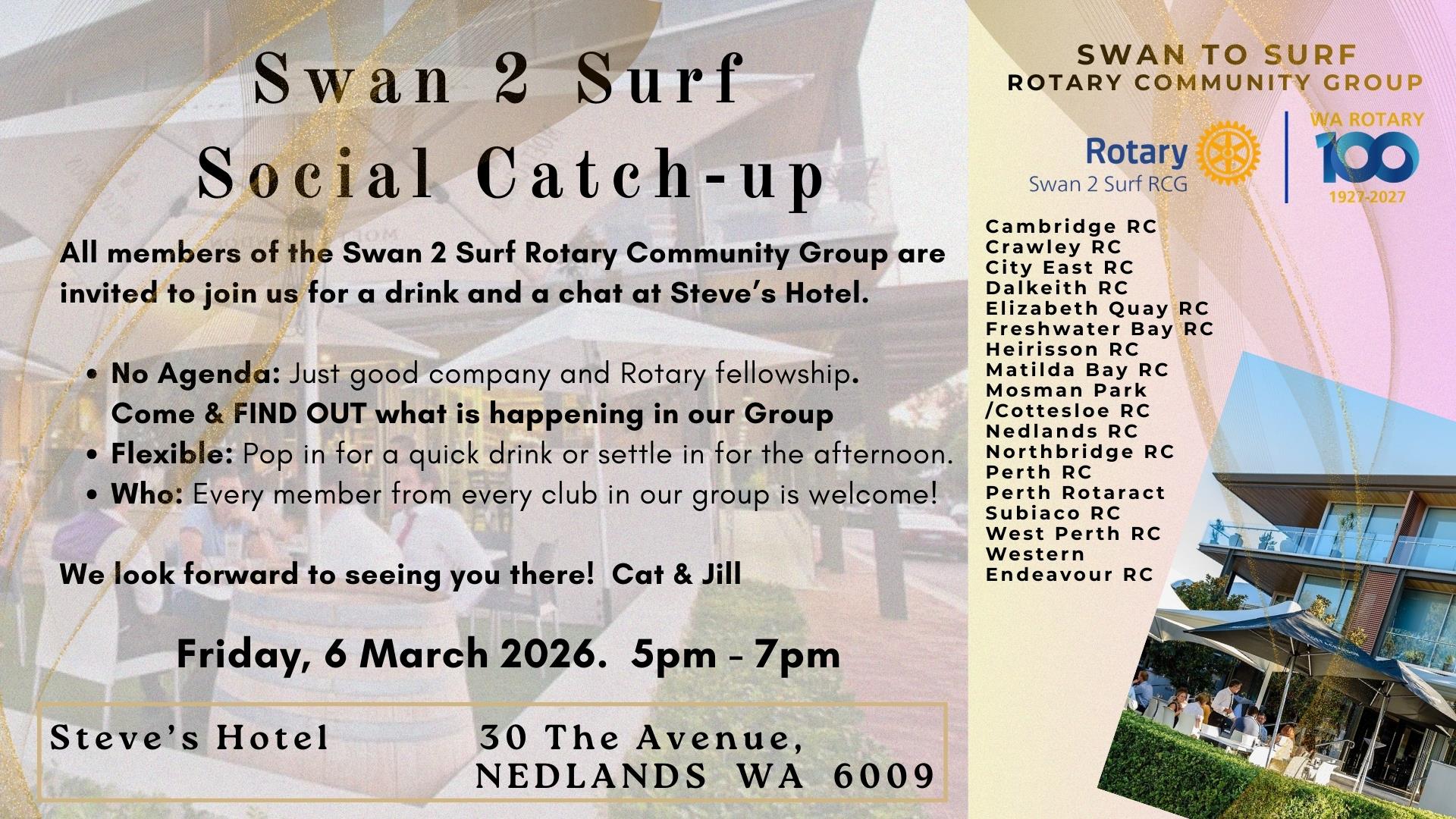 There is no formal agenda—just an opportunity for Rotarians from across the Swan 2 Surf RCG to enjoy good company and foster new connections. Every member from every club is warmly encouraged to attend.