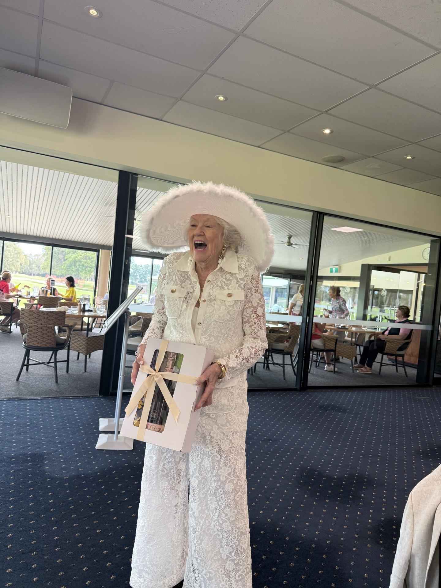 It comes as no surprise to anyone who knows her: Nan Walker was the undisputed winner of the best fascinator (or rather, BIG Hat) competition at the Royal Perth Golf Club Melbourne Cup luncheon this week! Nan looked resplendent all in white and happily received a bottle of Janz Sparkling Wine as her prize. (While she was seated at table #14, she didn't manage to draw the winning horse!)