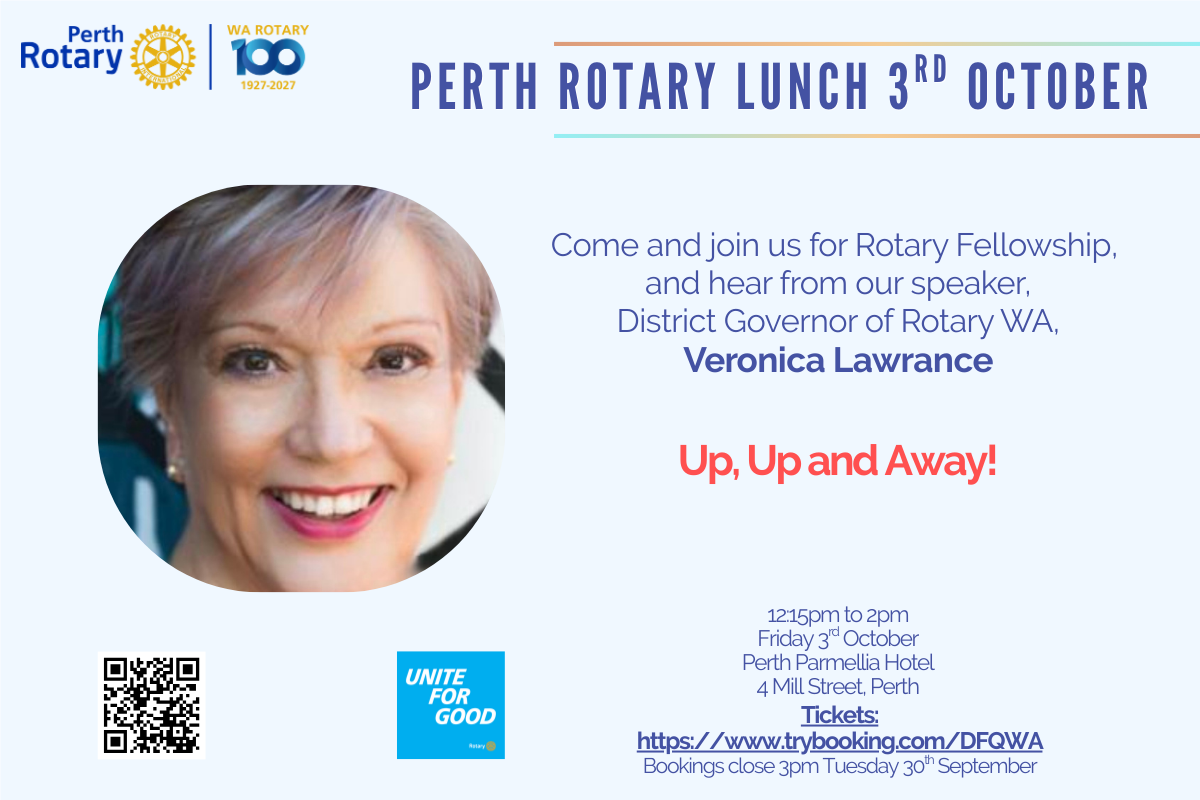 - Perth Rotary Business Lunch & District Governor Visit | Friday 3 October 2025. Booking Link https://www.trybooking.com/DFQWA