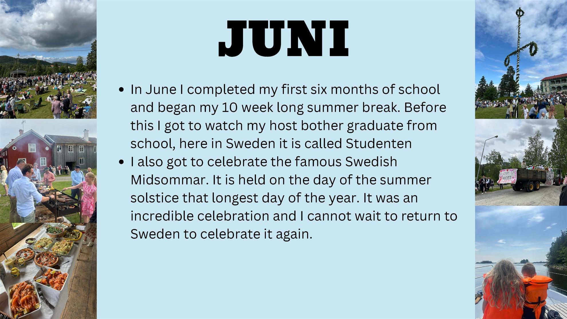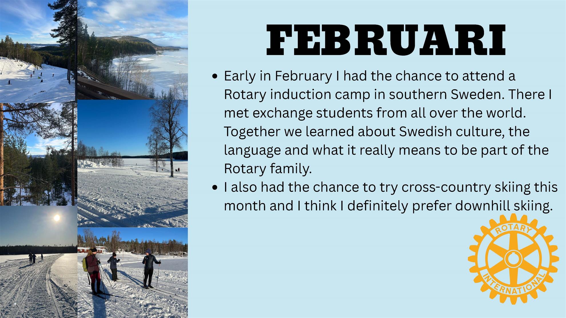 The Rotary Youth Exchange (RYE) program began informally in the 1920s with European clubs organizing short-term student visits. The first year-long exchange took place in 1958, leading to the program's expansion. Recognizing its value in promoting international understanding, Rotary International officially adopted RYE in 1975. Today, the program sends thousands of students to over 80 countries each year, with Rotarian volunteers managing all aspects of the exchange to foster cross-cultural friendships and peace. Eva Sussex is our current OUTBOUND RYE Student, spending a year in Sweden. Read on below for a visual feast of all that Eva has experienced thus far.